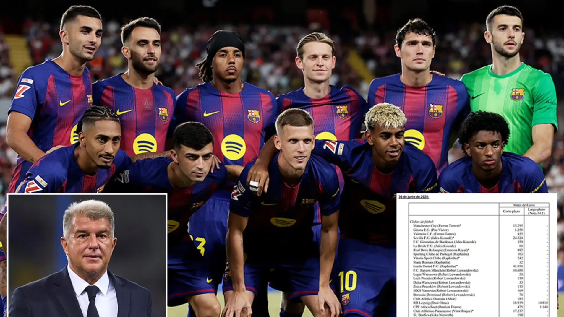 Theo báo cáo gần đây của Barcelona, câu lạc bộ vẫn nợ 42 triệu euro cho vụ chuyển nhượng Raphinha từ Leeds, 25 triệu euro cho vụ chuyển nhượng Kounde từ Sevilla và 10 triệu euro cho việc ký hợp đồng với Lewandowski từ Bayern Munich.
