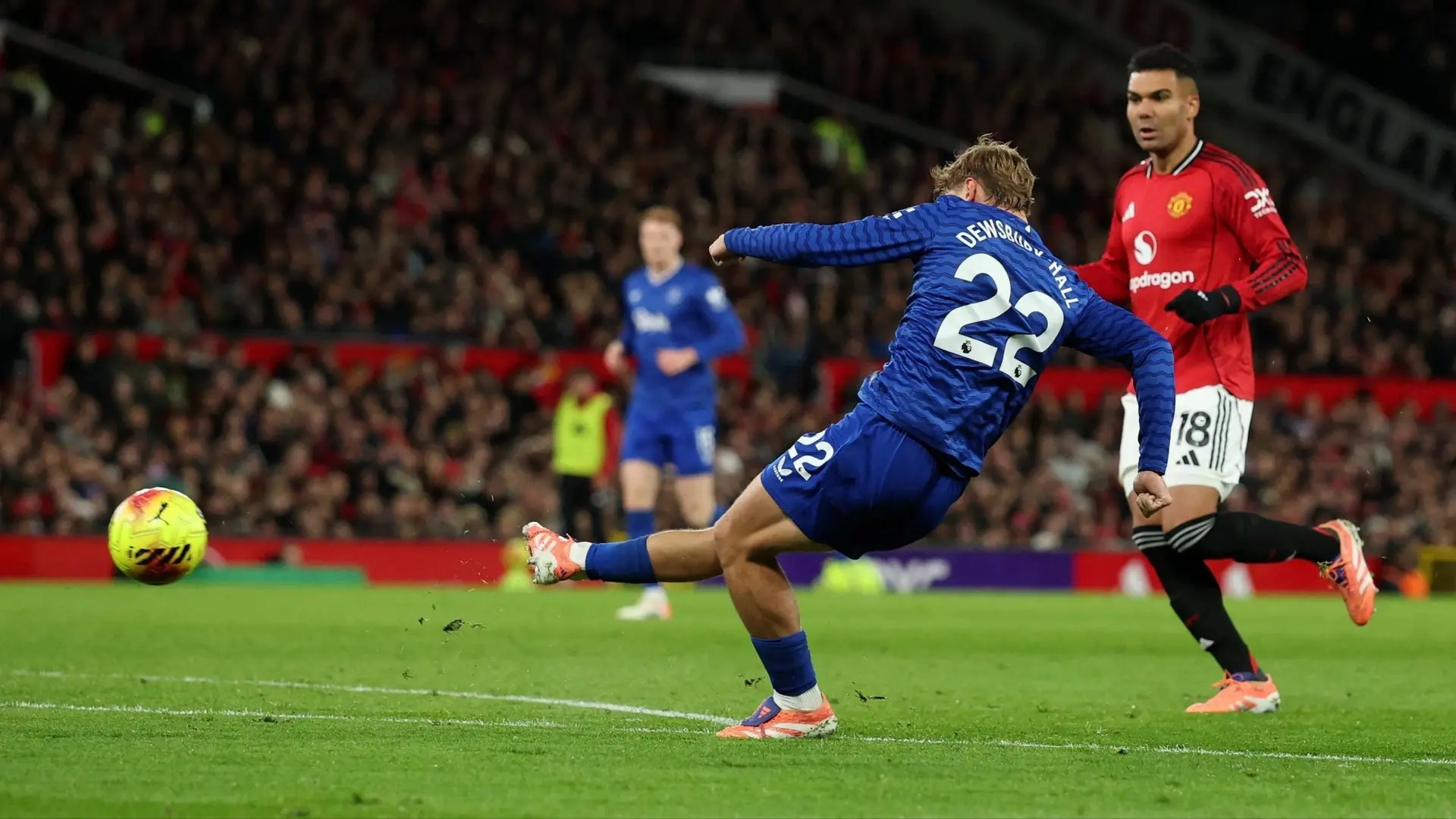 Với lợi thế nhân sự rõ rệt, Man United được kỳ vọng sẽ dễ dàng kiểm soát trận đấu. Thế nhưng, thực tế diễn ra hoàn toàn ngược lại. Phút 29, tiền vệ Kiernan Dewsbury-Hall của Everton tận dụng sai lầm từ một pha cắt bóng hụt của Lenny Yoro để tung cú sút xa kỹ thuật, giúp đội khách vượt lên dẫn trước. Sau bàn thua, Man United mới vùng lên gây sức ép. Đội chủ nhà tạo được một số cơ hội, nổi bật là cú sút xa của đội trưởng Bruno Fernandes ở phút bù giờ, nhưng thủ môn Jordan Pickford đã chơi xuất sắc. Hiệp 1 khép lại với tỉ số 1-0 dành cho Everton. Đội bóng vùng Merseyside trình diễn lối chơi kỷ luật, chắc chắn để có được lợi thế một cách xứng đáng.