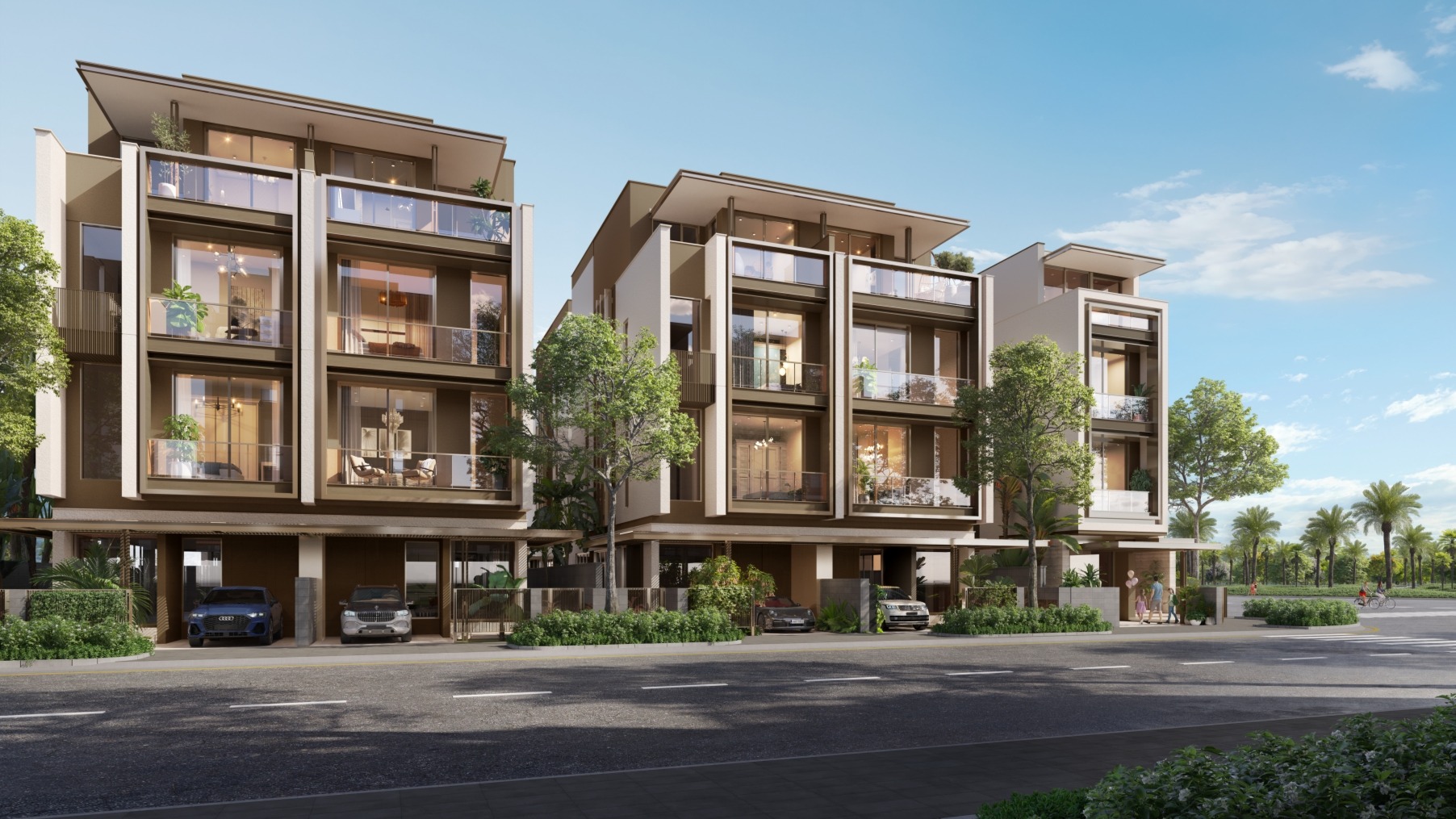 Biệt thự song lập tại SOLA với mặt đứng đồng điệu và khoảng mở được tinh chỉnh để đảm bảo sự riêng tư trong từng trải nghiệm sống.